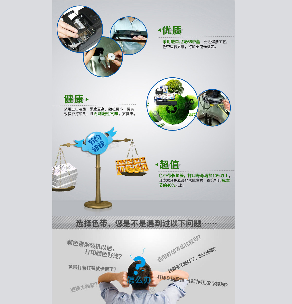 普通品牌色带,做工粗糙,堵塞打印头,会损坏打印机,不耐打,使用寿命很短,需要很频繁更换。 我们的品牌色带耐久打,弹力强,长期打印不堵打印头,流动性好,打印更清晰,经济实惠,寿命更长。