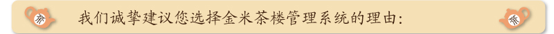 【可租可买、高端大气上档次】金 米软件为不同需求的客户提供【单店单机版】【连锁店单机版】【单店局域网版】【异地连锁店版】,为了减轻茶楼经营成本压力和投资风险,金米软件打破传统销 售模式,可提供软件租用授权。全国超过500家茶楼行业同仁在线使用,打造出了金米软件在国内茶楼管理软件中的领军地位,确保您的投入物有所值。价格低, 客户多,是一款真正的高端大气上档次的茶楼经营管理系统。系统以“多快好省(功能多、上手快、性能好、省钱)”的设计理念打造,好用、易用。无论您是茶楼 老板、店长、财务人员还是服务人员,金米茶楼软件都是您最得力的助手,帮您减轻工作强度,令日常工作中的各种管理难题迎刃而解。